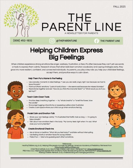 The Parent Line publishes a quarterly parenting education newsletter for parents with young children, a resource directory for parents, and information for new parents.